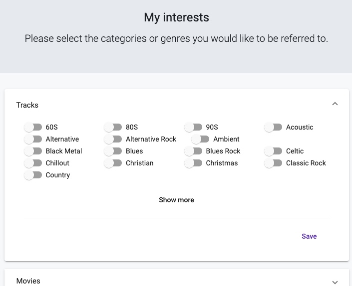 Your interests In this section, you can indicate your interests for each type of media. These pieces of information will help us recommend you more relevant content.